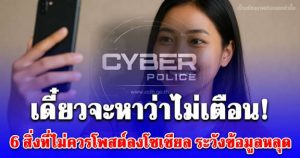 วันที่ 21 พฤศจิกายน 2568 มีรายงานว่า เพจเฟซบุ๊ก ตำรวจไซเบอร์ – บช.สอท. ได้มีการโพสต์ภาาพและข้อความเตือนระบุว่า 6 สิ่งที่ไม่ควรโพสต์ลงโซเชียล! ระวังข้อมูลหลุด เสี่ยงถูกมิจฉาชีพเล่นงาน