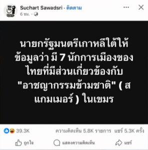 ขณะที่ คุณสุชาติ สวัสดิ์ศรี ก็ได้ออกมาเปิดเผยเช่นกัน โดยอ้างว่า นายกรัฐมนตรีเกาหลีใต้ให้ข้อมูลว่า มีนักการเมืองของไทยที่มีส่วนเกี่ยวข้องกับ อาชญากรรมข้ามชาติ (สแกมเมอร์) ในเขมร