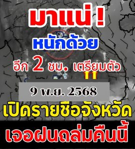 09 พฤศจิกายน 2568 พยากรณ์อากาศ 24 ชั่วโมงข้างหน้า ภาคเหนือมีฝนตกหนักบางแห่ง โดยเฉพาะบริเวณจังหวัดแม่ฮ่องสอน เชียงใหม่ เชียงราย ลำพูน ลำปาง พะเยา และตาก เนื่องจากหย่อมความกดอากาศต่ำปกคลุมด้าน ตะวันตกของภาคเหนือและประเทศเมียนมา ขอ ให้ประชาชนในบริเวณดังกล่าวระวังอันตราย จากฝนตกหนักและฝนที่ตกสะสม ซึ่งอาจทำให้ เกิดน้ำท่วมฉับพลัน น้ำป่าไหลหลาก และน้ำล้น ตลิ่ง โดยเฉพาะพื้นที่ลาดเชิงเขาใกล้ทางน้ำ ไหลผ่าน พื้นที่ลุ่ม และพื้นที่น้ำท่วมขัง ส่วน เกษตรกรควรป้องกันและระวังความเสียหายที่ จะเกิดต่อผลผลิตทางการเกษตร