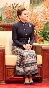สมเด็จพระนางเจ้าฯ พระบรมราชินี ทรงสง่างามในฉลองพระองค์ชุดไทยพระราชนิยม โดยนำชุดไทยอมรินทร์มาประยุกต์กับกระดุมคู่ตามแบบชุดของจีน ในพิธีรับเสด็จ อย่างเป็นทางการ ณ มหาศาลาประชาชน กรงปักกิ่ง ในโอกาสที่ พระบาทสมเด็จ พระเจ้าอยู่หัว และสมเด็จพระนางเจ้าฯ พระบรมราชินี เสด็จฯ เยือนประเทศจีน ตามคำ ทูลเชิญของประธานาธิบดีจีน